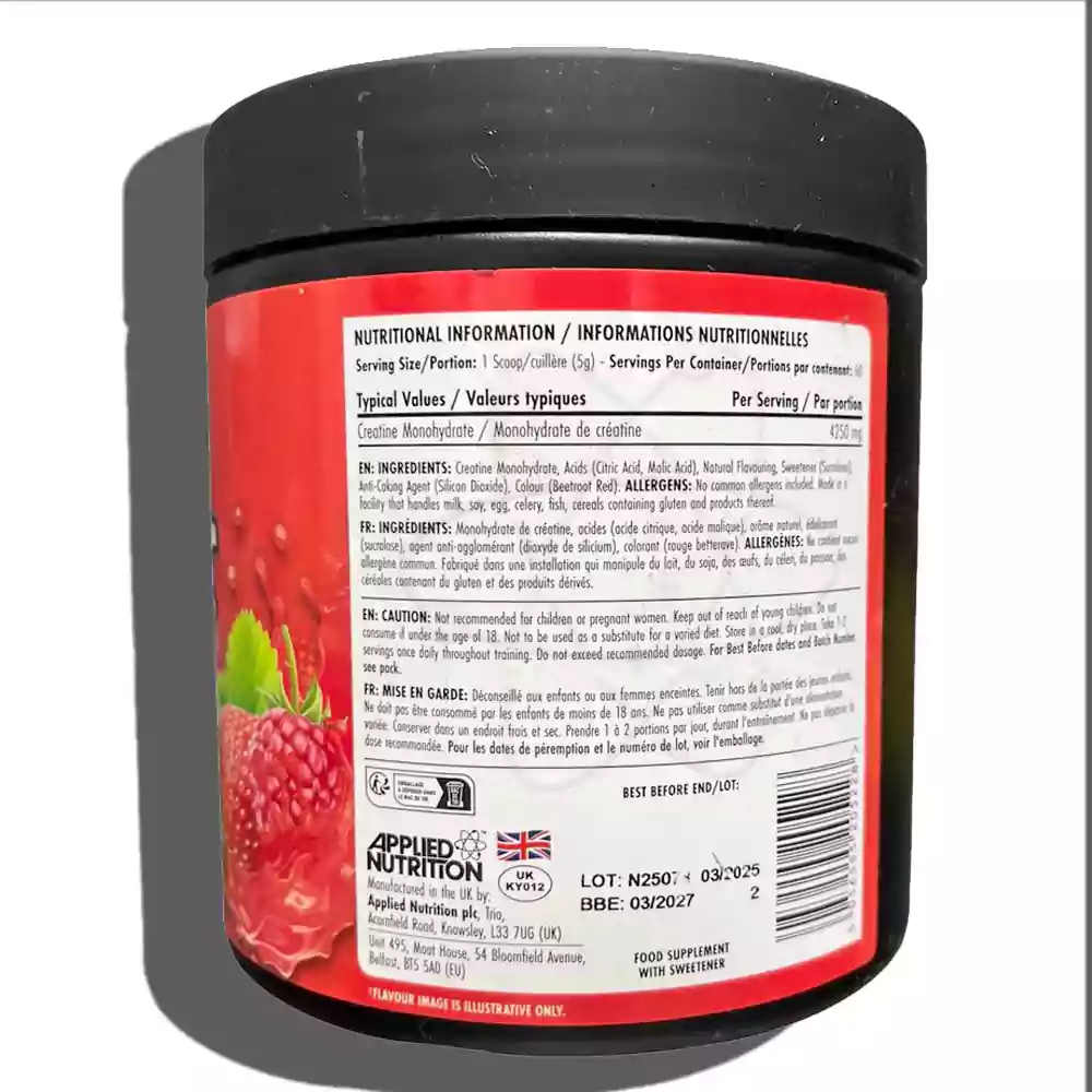 کراتین مونوهیدرات طعمدار بادی فیول ۳۰۰ گرمی اپلاید ناتریشن (Applied Nutrition BodyFuel Flavoured Creatine Monohydrate) یک مکمل کراتین میکرونیزه با کیفیت بالا از برند معتبر اپلاید ناتریشن انگلستان است. این محصول برای ورزشکارانی که در تمرینات سنگین و طولانیمدت شرکت میکنند و به دنبال بهبود عملکرد بدنی، افزایش قدرت عضلانی و تسریع ریکاوری هستند، طراحی شده است. هر وعده (۵ گرم) حاوی ۴.۲۵ گرم کراتین مونوهیدرات خالص است که با طعمهای دلپذیر مانند چری و سیب، توتفرنگی و تمشک، و آیس بلو رز عرضه میشود. این مکمل با فناوری میکرونیزاسیون تولید شده که جذب سریعتر و هضم آسانتر را تضمین میکند. کراتین مونوهیدرات اپلاید ناتریشن دارای گواهینامه حلال بوده و برای گیاهخواران نیز مناسب است.