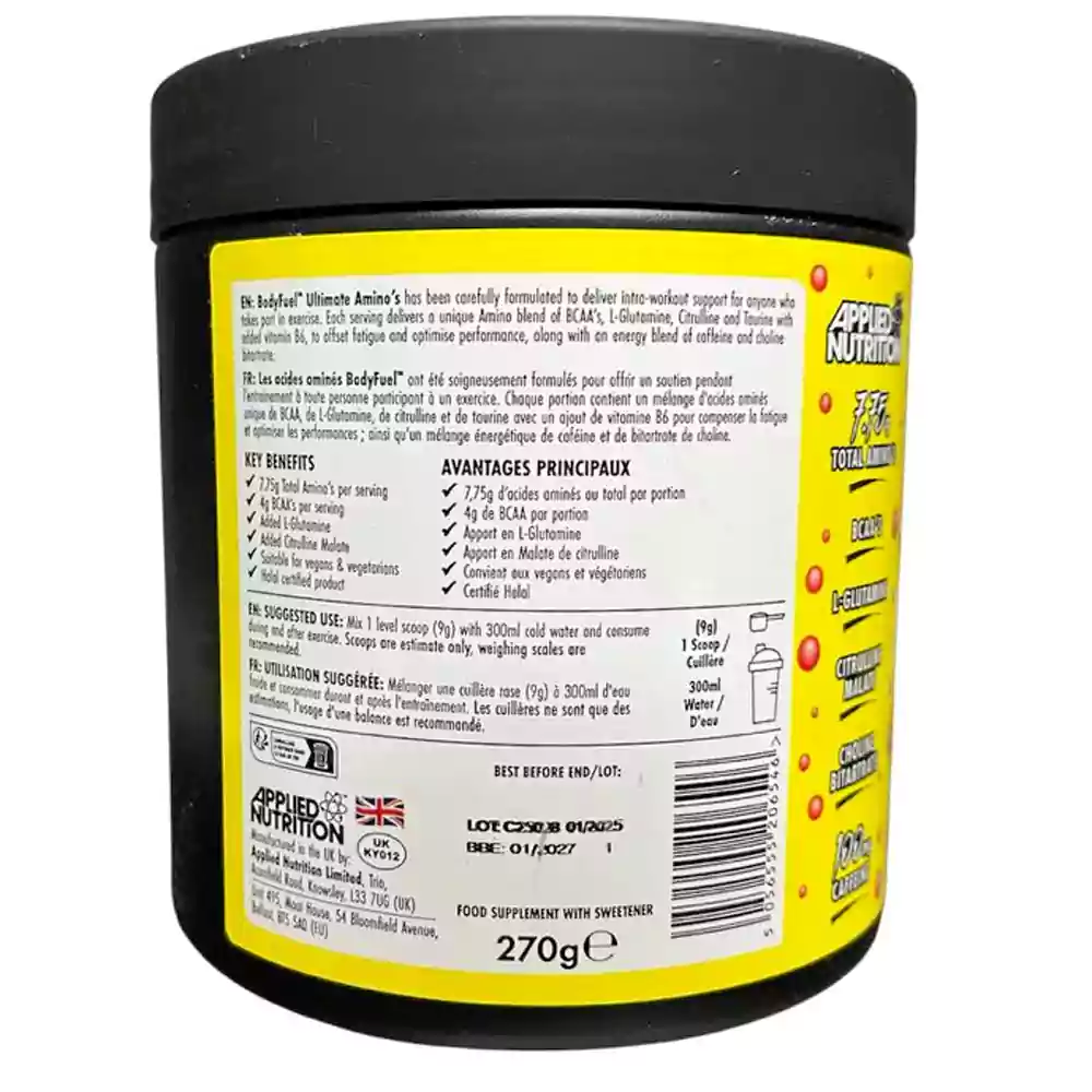 آمینو انرژی بادی فیول ۲۷۰ گرم اپلاید ناتریشن، حاوی ۸.۵ گرم EAA و ۶ گرم BCAA در هر وعده